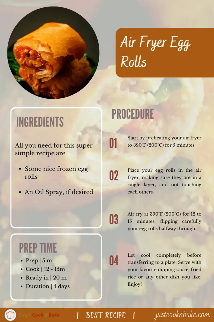 As explained in this article, you can use my recommended recipe and cooking tips to cook your air fryer egg rolls.